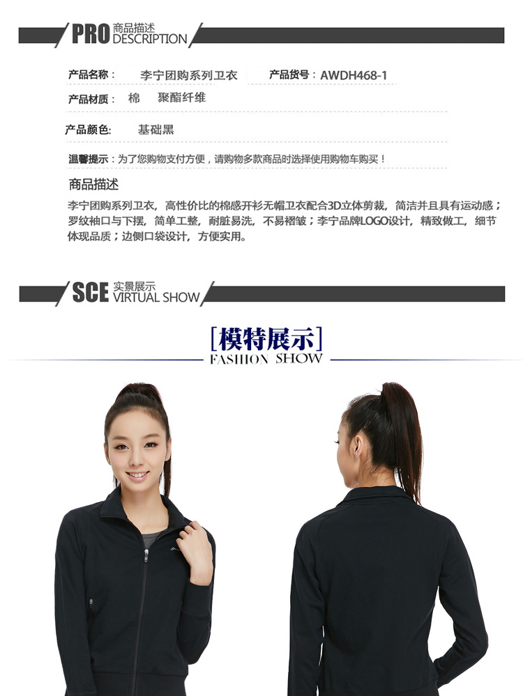 李寧(LI-NING)AWDH486-1 女子團(tuán)購(gòu)系列無(wú)帽開(kāi)衫衛(wèi)衣基礎(chǔ)黑XL
